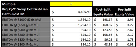 From here though you can see there is no value to upstream to Liberty Interactive and certainly not to QVC Group. I am struggling to make it work as is and it's very likely a 4.5x multiple will be used here which lowers value further. And again, the above was without dilution factored. Even if Liberty got 5% in warrants these would be further diluted with MIP, rights, and various other things. QVC Group owns Liberty Interactive which only owns a stub of QVC the asset. No more cash dividend either to QVC Group. What does this make QVCGA worth? Assuming they don't file at the same time or shortly after and equity isn’t cancelled out.