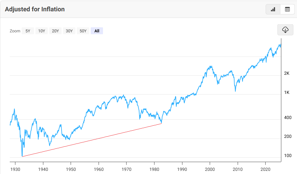 One possibility is that there is an S&P high this year and an inflation adjusted low in 2032. Previous inflation adjusted lows are July 1932 and August 1982.