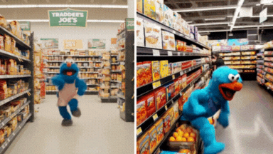 Create a video of a muppet running through a Trader Joe's grocery store in a panic.