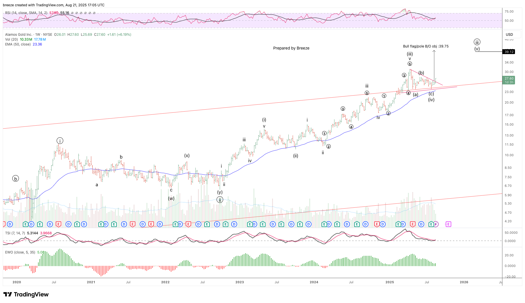 AGI Wave Count Update. Triangle breakout confirms Wave (iv) is complete. Wave (v) of Minute Wave (circle) iii is in play with a target of 39.12. And break out from a bull pennant/pole formation projects an objective of 39.75 and supports the count. Breeze