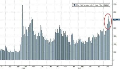 Similar to earlier this week, the momentum higher in China A was well-supported by trading activity in the market: turnover was above 2 tn yuan for the 8th day in a row, the longest such stretch on record