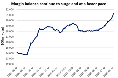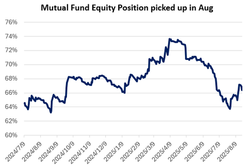 Outside of the Goldman client base, there is also increasing positioning by external institutions as well. Insurance funds have been flowing in: this week we see PingAn announced increased holding in China Pacific, China Life and Agri bank. Mutual funds equity positioning picked up in Aug too.