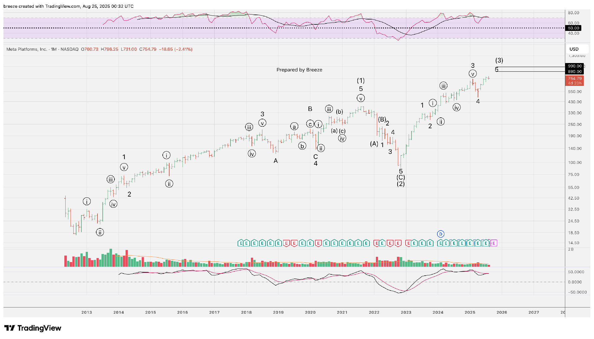 META Big Picture Wave Count on a Monthly Logaritimic ChartUpdate - all data. Minor Wave 5 of Intermediate Wave (3) in play with a target range of 890 - 990. Breeze