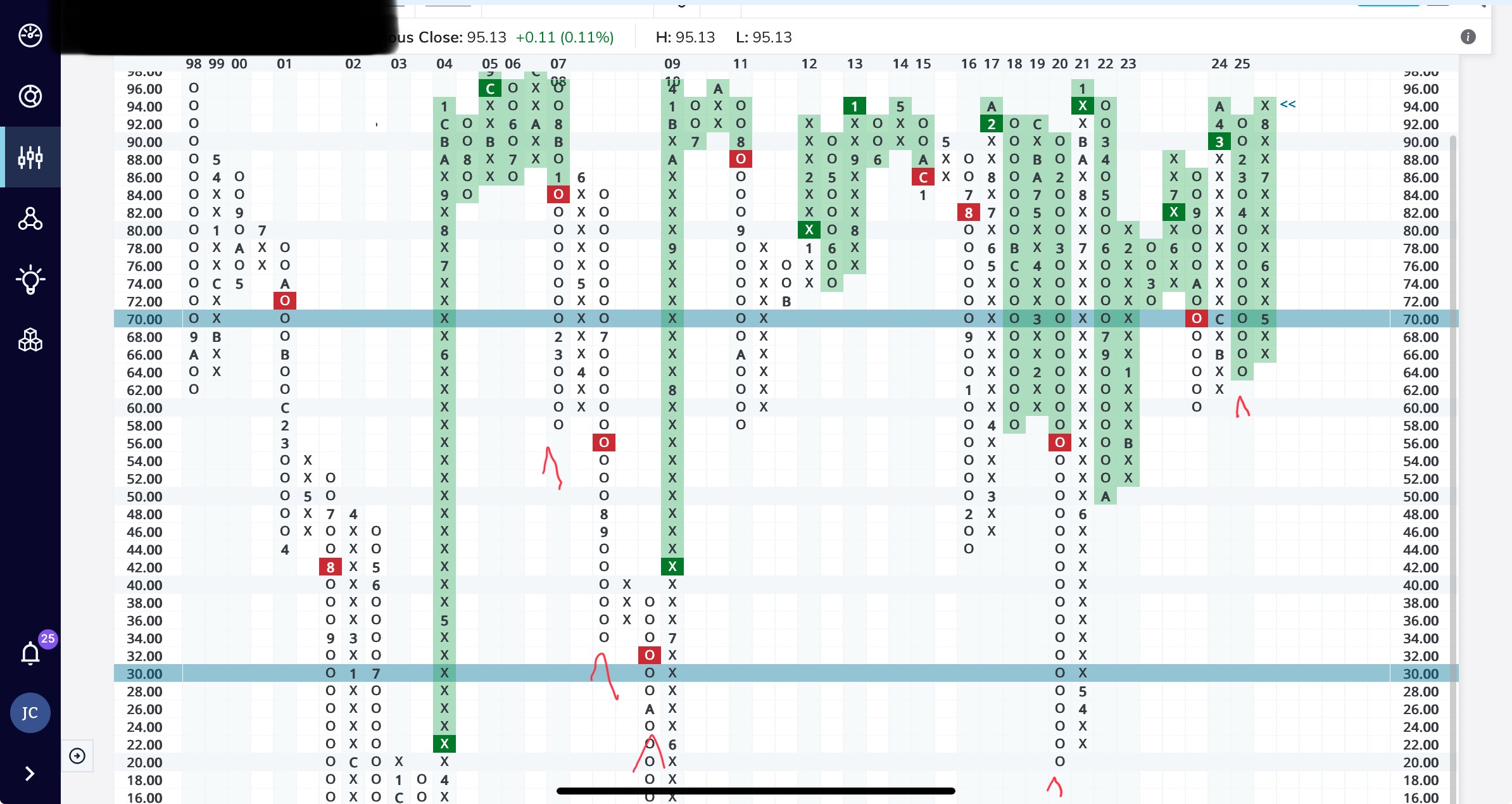 There are many indicators I look at to get a sense of the market, but this is my main indicator. After yesterday’s action, again it was up on the day even though the market was down. I’ve placed red markers below significant down events, the 2008 market crash, 2020 covid and April’s Tariff scare. I pay attention when this indicator reverses down(and up as well as in May of 2009). I look at other indicators for confirmation of its direction. You can do a look-see at other times it reverses for your own correlation.
