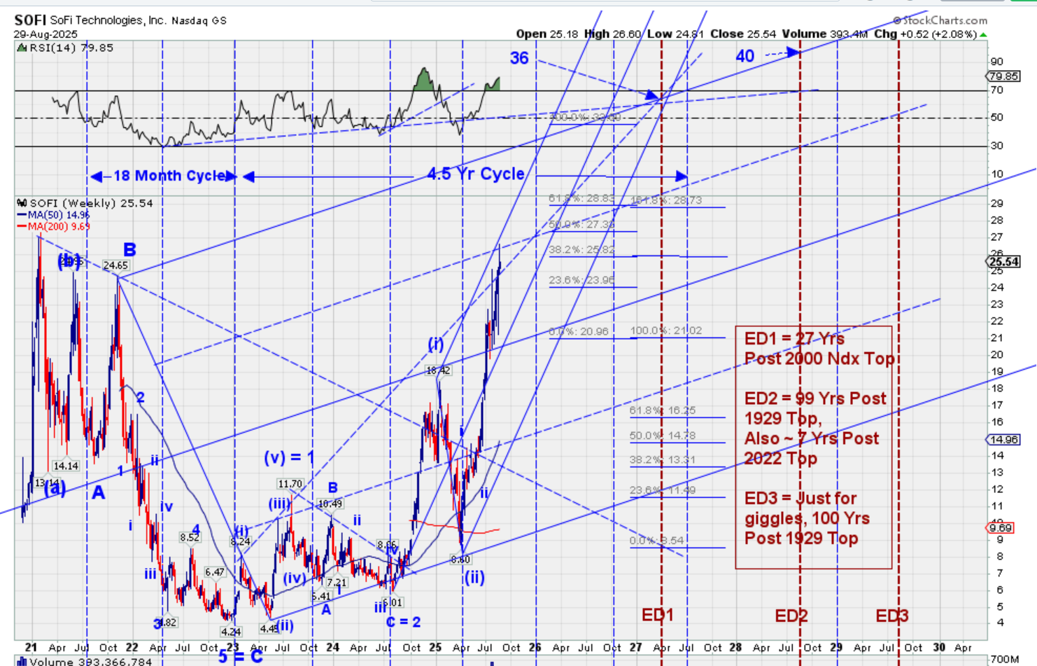 I have Sofi in a (iii) of 3 up, not yet complete. Possible fib extension top coming up, at 28.73. Then maybe a decent little correction. Sofi has not missed a 9 month or 18 month cycle low, next one due end of year. To hit that low, gotta have a top first.