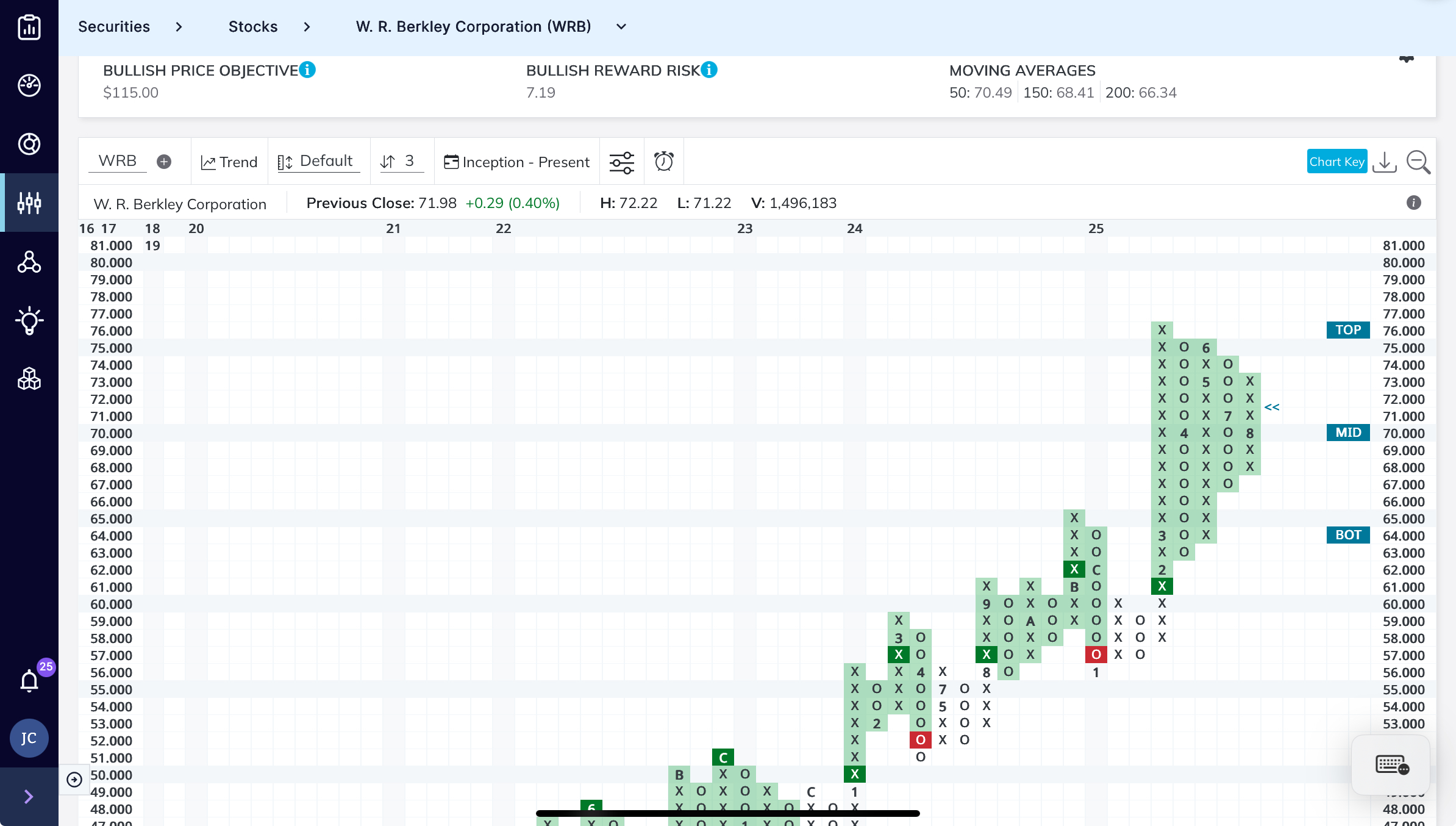 WRB currently the longest P&F Buy signal since July 2000. Forming a triangle pattern. Breakout (bullish) above $76. Could be trouble with a close below $66.