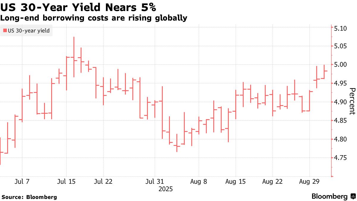 The yield climbed as much as four basis points to 4.999% on Wednesday before paring its advance, mirroring similar moves in the UK and Japan, where a deepening selloff pushed borrowing costs to the highest this century.