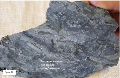 Figure 1. Photo showing hydrothermal mill breccia cutting diatreme breccia. Disseminated pyrite (light coloured flecks) are seen throughout the sample. Inset shows diatreme breccia with abundant rhyolite, rhyolite porphyry and lesser basaltic fragments with disseminated pyrite. (CNW Group/Northern Shield Resources Inc.) Figure 2a. Sample from newly exposed hydrothermal system hosted within the diatreme breccia. Sample appears to consist of well banded cherty sediments that have been silicified, pyritized and brecciated by continuous up-welling of hydrothermal fluids. (CNW Group/Northern Shield Resources Inc.) Figure 2b. Example of hydrothermal breccia with rounded clasts of chalcedonic silica “ooze” in a silica-pyrite matrix. (CNW Group/Northern Shield Resources Inc.) Assays from drill core samples are still pending, with complete results expected in a few more weeks.