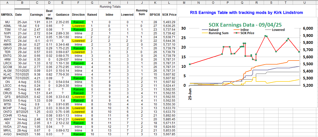 SOX Components Earnings' Table - Final Update of the Quarter - AVGO Beats and Raises But Fails to Excite Until they announce a new $10 Billion AI Customer. My thoughts on the quarter are that it was above average with plenty of beats and more raises than component companies lowering guidance. What now? Does the SOX continue on to new highs or are we headed for a Double Top? More on that soon but the table is below: