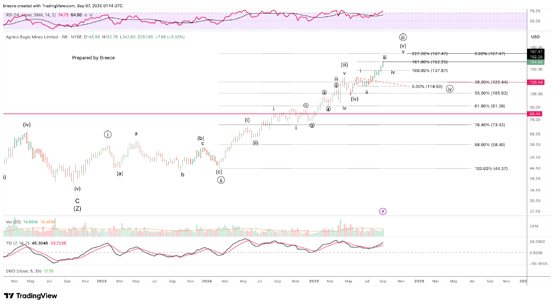 Berk, I've overlaid the Fibonacci template for the projected wave count I posted for AEM. Once the a wave one and wave two are complete, I overlay this template. In this case Wave iii is at the 161.8% line, the Wave iv is at the 100% line and the Wave v is at the 227.8% line. I adjust once a projected wave is complete. I developed this template. First time I've shared it. Breeze