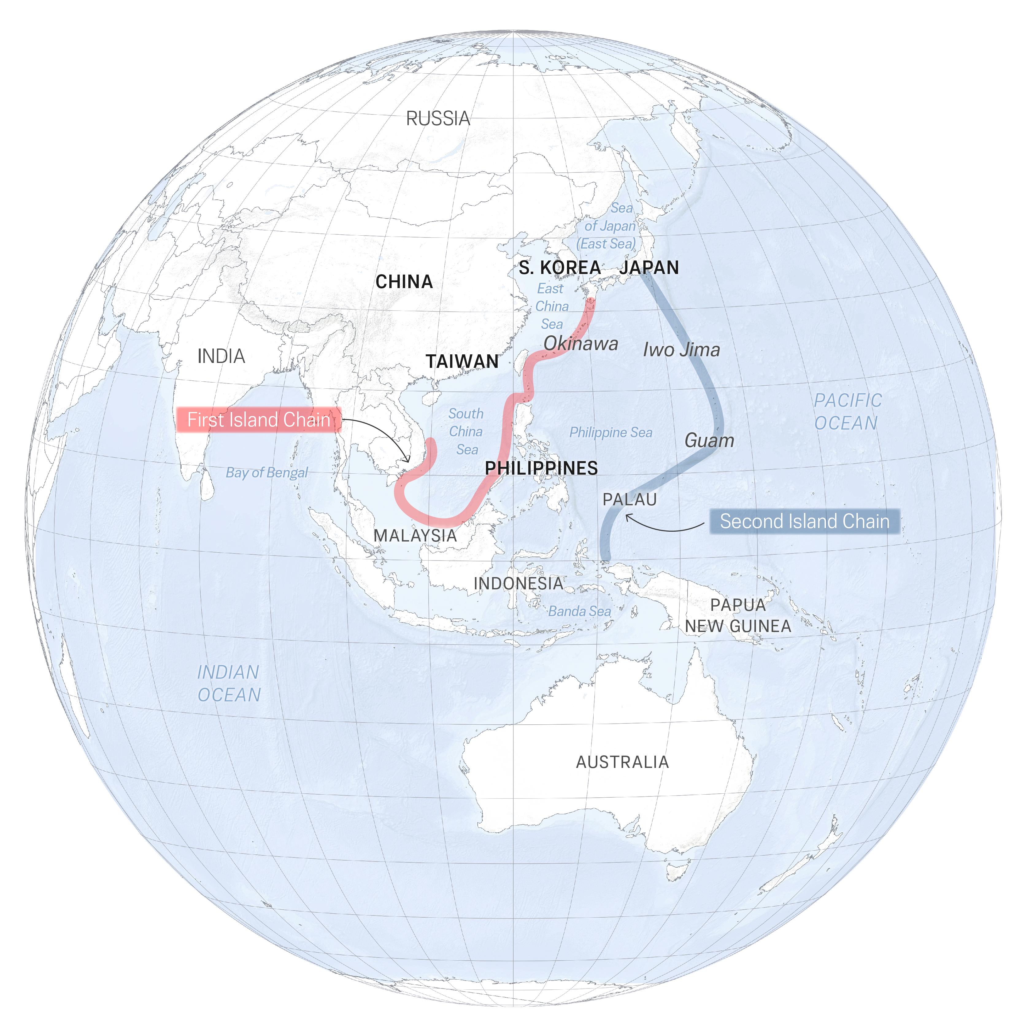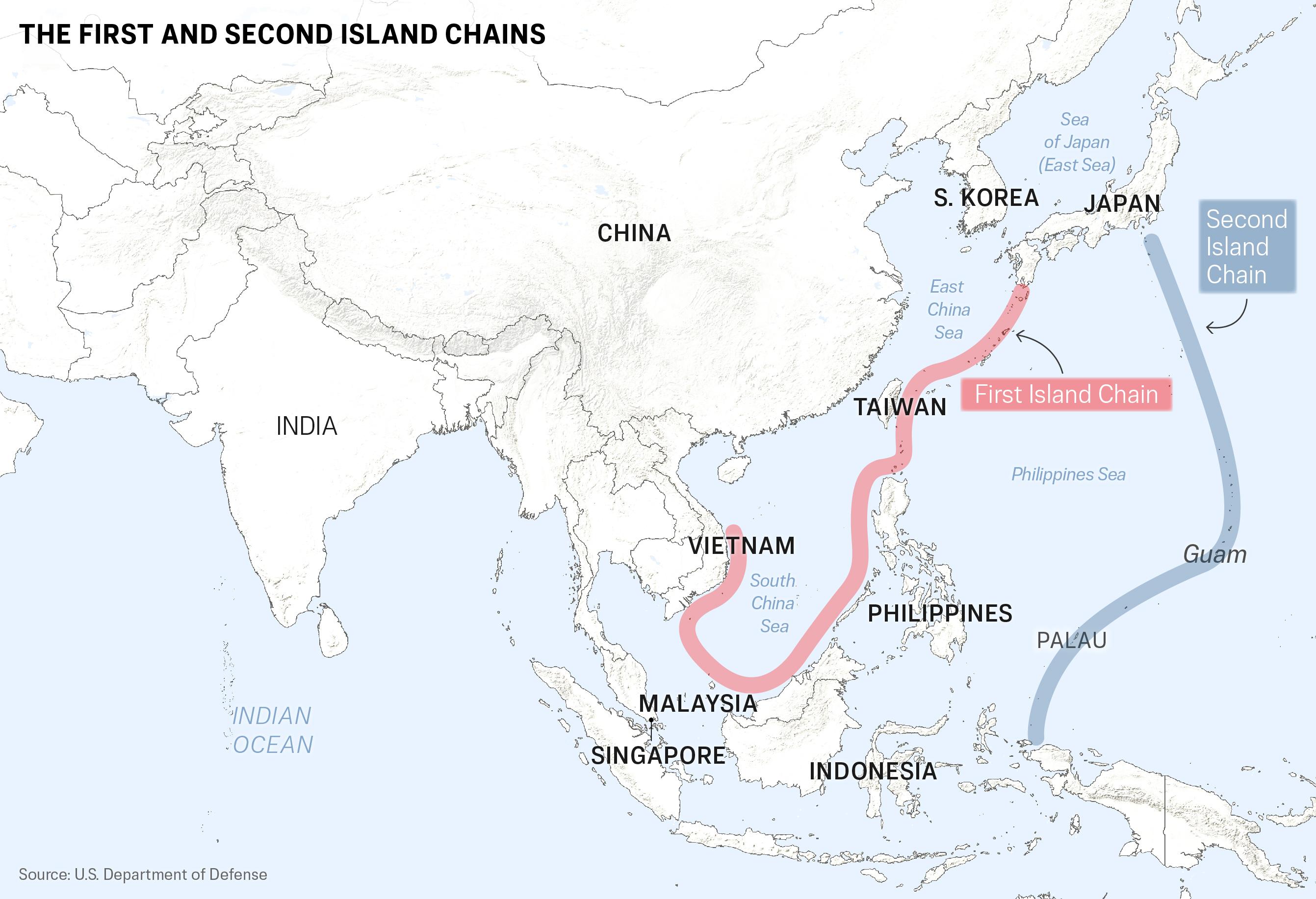 The first island chain extends through a series of archipelagoes from Japan down through Taiwan and the northern Philippines to Borneo and the Malay Peninsula. It forms a natural barrier along China’s coast.