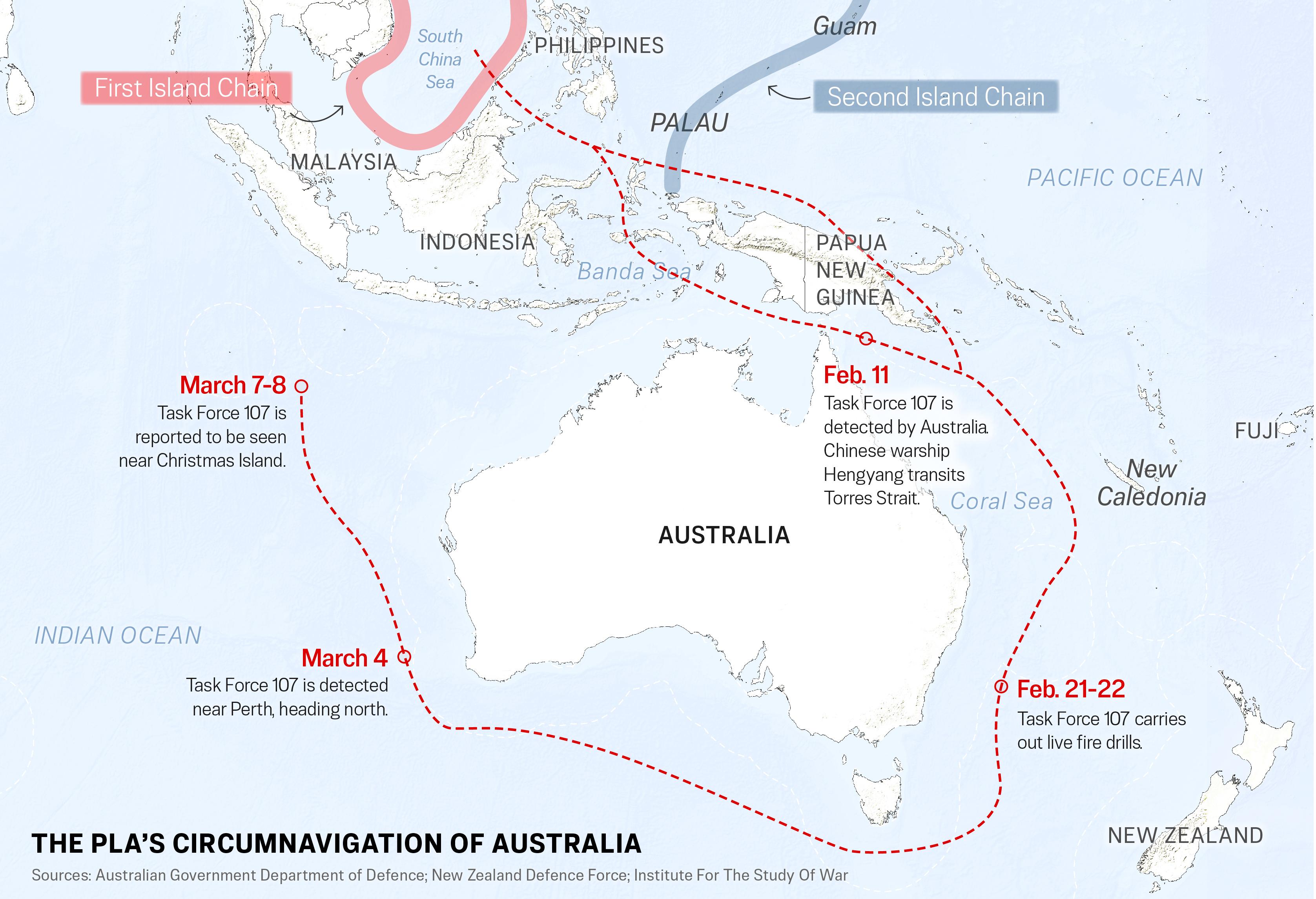 The operation began on Feb. 11, with the ships maneuvering both separately and in formation through the Coral Sea, where a Royal Australian Navy frigate maintained visual contact. From Feb. 21 to Feb. 22, the task force carried out live-fire drills in international waters, with New Zealand monitoring the exercises.
