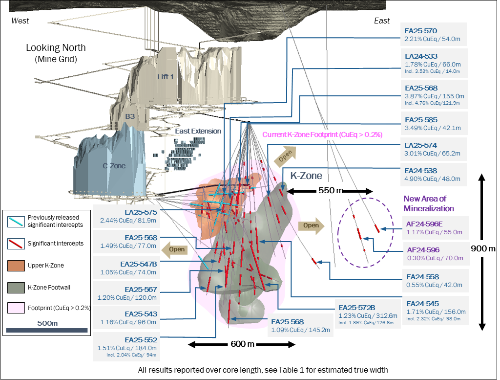 • 1.32% copper and 1.60 g/t gold (2.44% CuEq) over 81.9 metres core length (62 metres estimated true width) in Borehole EA25-575