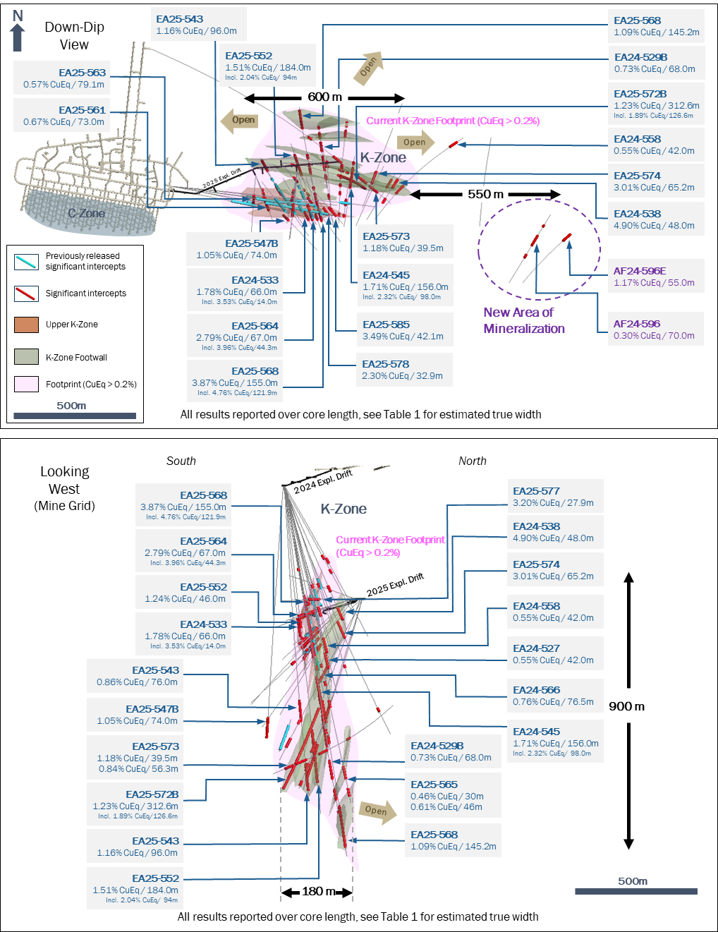 Additionally, exploration drilling intersected new copper-gold porphyry mineralization in previously unexplored areas to the east of K-Zone. Borehole AF24-596E, drilled from surface, intersected 0.75% copper mineralization and 0.59 g/t gold (1.17% CuEq) over 55 metres core length in volcanic rocks located 550 metres to the east of the current K-Zone footprint.