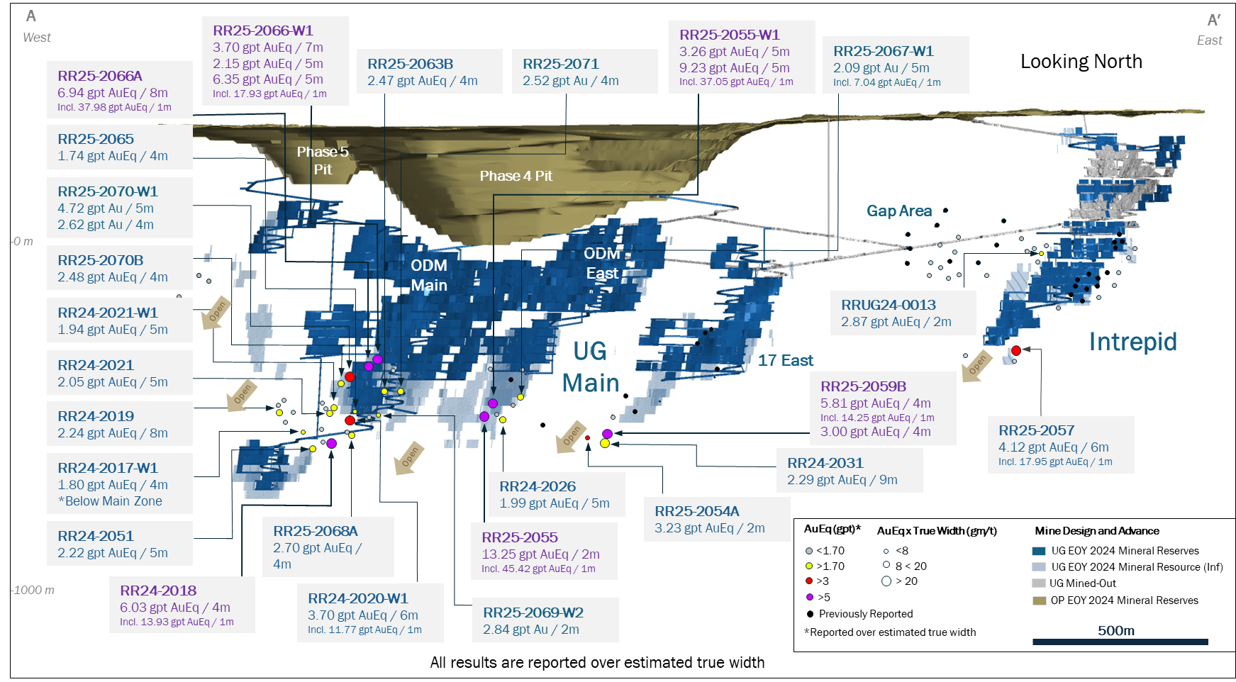In the underground mine, new surface drilling has confirmed strike and down-plunge extensions of the ODM Main, ODM East, 17 East, and Intrepid zones. Infill drilling is also supporting the ongoing conversion of inferred to indicated resources across all zones. With additional underground exploration platforms becoming available in 2026 and 2027, the next phases of drilling are expected to accelerate Mineral Resource and Mineral Reserve development across the ODM and Intrepid systems. All new notable drilling intercepts in the underground mine are summarized in Table 3 below. All Rainy River Locations and orientations of drilling are listed in Table 5.