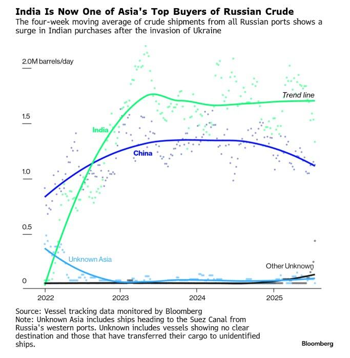 According to Bloomberg, any US action would ultimately depend on Trump, who has so far refrained from punishing Russia directly despite skating through several self-imposed deadlines and Putin’s continued reluctance to negotiate an end to the war. Trump has, however, already doubled tariffs on India to 50% over its continued purchase of Russian oil. He has so far refused to punish China for doing as much energy trade with Russia as India.