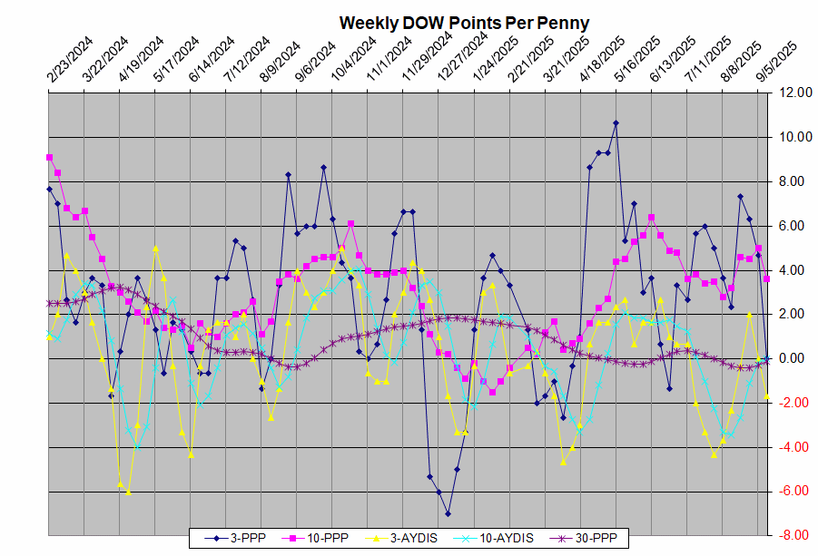 9-12-2025, Weekly Climax Model charts, So, Saturday morning after running the weekly model somehow, I saw a problem with the weekly change value. I go look at the first two stocks and found the AAPL had the correct cell formula, next stock and all 29 had one digit off. Since July 2022 when I made this chart, so I had to start the chart from scratch, six hours of clicking and typing and a good thing it happened this week.