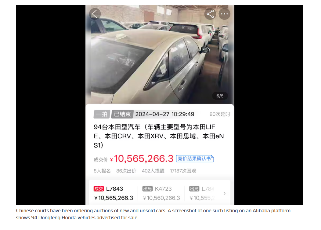 Chinese courts, too, have been holding auctions for new and unsold cars belonging to defaulted dealers. One Alibaba listing in April 2024 that advertised a batch of 94 cars made by Dongfeng Honda, the Japanese automaker’s joint venture, showed photos of vehicles parked indoors. The white body of one was coated with grime. The front seats were covered in plastic sheets. Dongfeng didn’t respond to questions; Honda said it couldn't comment on the activities of its authorized dealers.