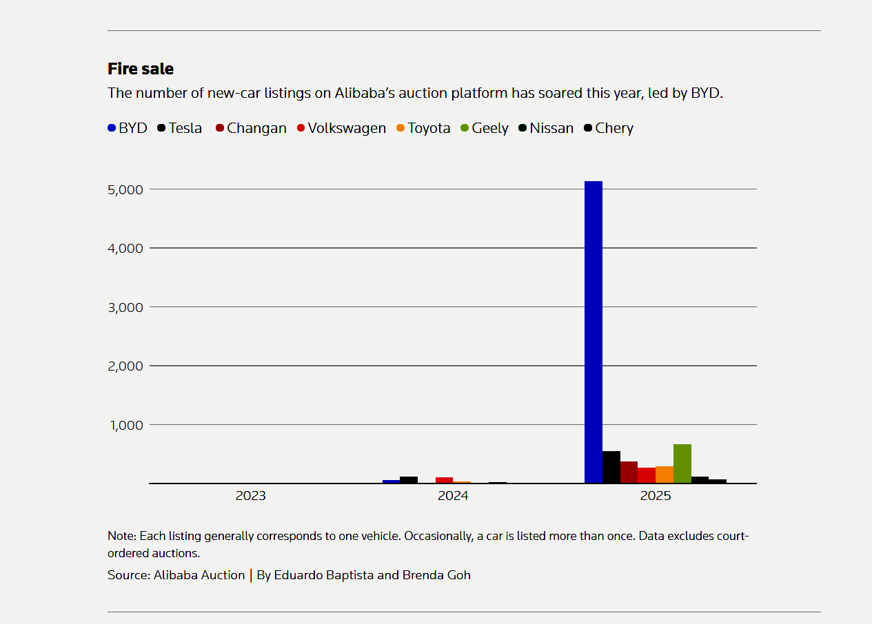 Other cars end up parked for the long term on auction sites, including those run by e-commerce giant Alibaba. Many get no bidders. A Reuters review of Alibaba listings identified more than 5,100 auction notices this year for brand-new BYD cars that had been insured and registered, up from 61 in 2024. Alibaba and BYD didn’t address questions about the listings, which haven’t been previously reported.