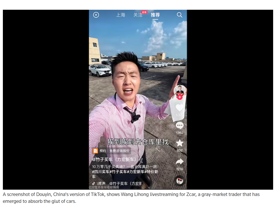 VEHICLE SURPLUS DRIVES LIVESTREAM SALES At the Chengdu mall, Wang Lihong navigates a rooftop parking lot on a scooter while clutching a selfie stick, capturing video for social media. Wang is a livestreaming host for Zcar, one of the gray-market traders flipping brand-new vehicles that dealers couldn’t sell.