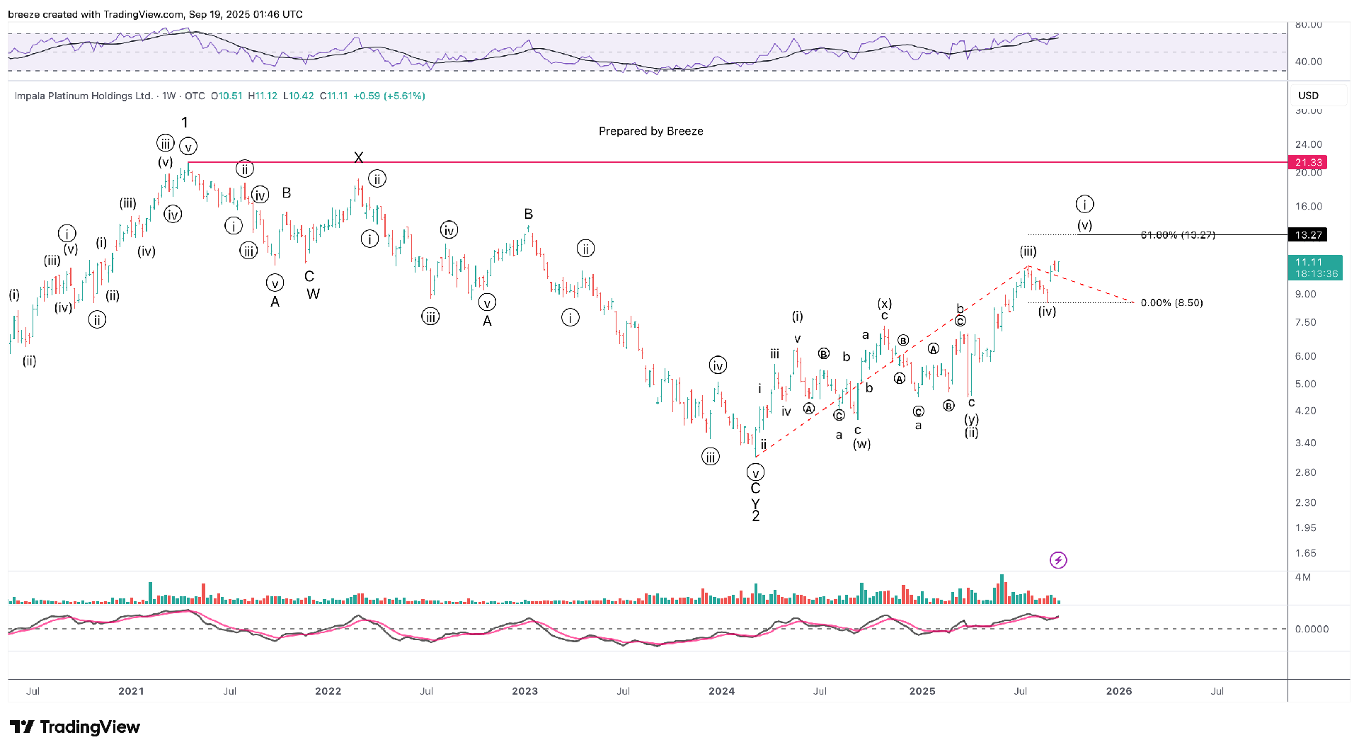 IMPUY Wave Count Update. Wave (v) of Intermediate Wave (circle) i is in play with a target of 13.227. Breeze