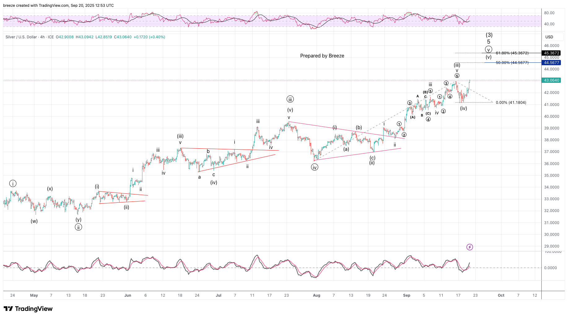 Spot Silver Wave Count Update. Wave (v) of Minute Wave (circle) 5 of Minor Wave 5 of Intermediate Wave (3) is in play with a target of 44 - 45. Breeze