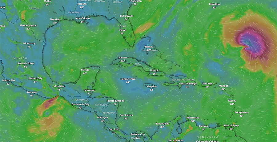 disturbances have formed off Mexico's Pacific coast- Gabrielle is encountering a LOT of dust, but still likely to reach hurricane strength tomorrow. South of Houston the Gulf of Mexico surface temp: 86 degrees,