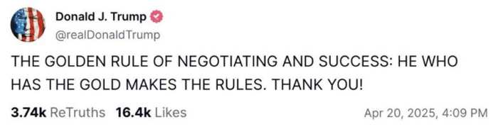 Maybe it’s time to ask if your financial adviser thinks gold is “too old-fashioned” for your portfolio — while central banks scoop it up. Trump’s not whispering about this either — a few weeks ago he posted his “golden rule” in all-caps on his Truth Social account, like it came straight from the Book of Deals.
