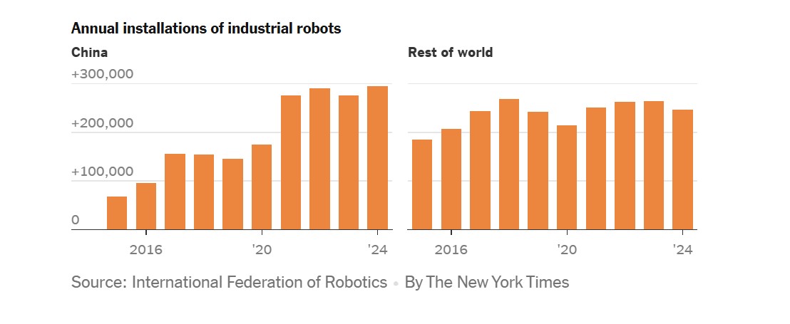 China’s share of the world’s robot manufacturing rose last year to a third of the global supply, up from a quarter in 2023, according to the federation. Japan, the previous leader, dropped to 29 percent of the world market from 38 percent the year before.