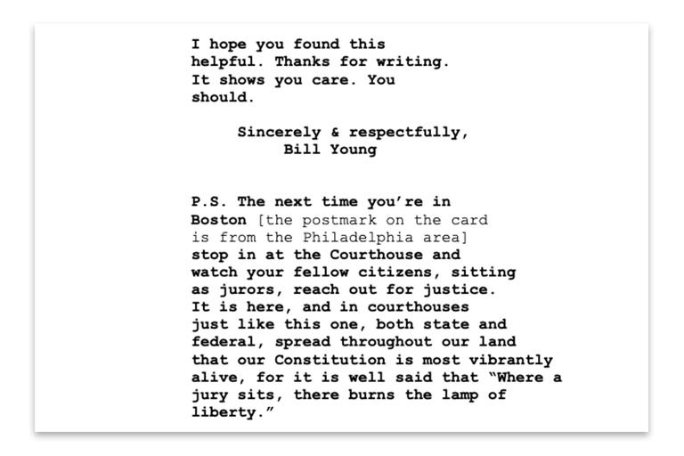 P.S. The next time you’re in Boston [the postmark on the card is from the Philadelphia area] stop in at the Courthouse and watch your fellow citizens, sitting as jurors, reach out for justice. It is here, and in courthouses just like this one, both state and federal, spread throughout our land that our Constitution is most vibrantly alive, for it is well said that ‘Where a jury sits, there burns the lamp of liberty.’