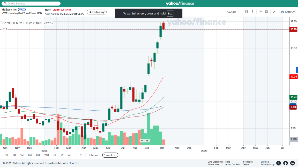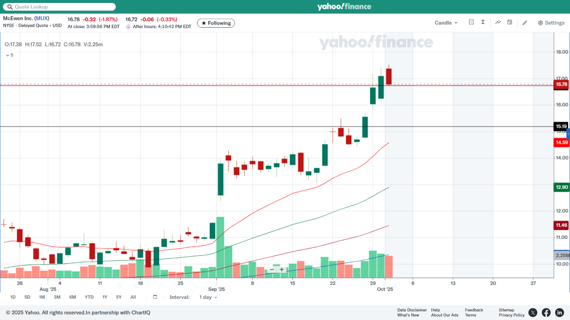 MUX moved yet higher on the daily chart this week, forming higher highs and higher lows after Fridays gap-up. The highest closing price we've had so far is $17.10 which was on Tuesday and with a high of $17.52 which was today while forming a red candlestick. The upper black line is Tuesdays pivot point ($16.76) and todays low was $16.72, while closing just above the pivot line at $16.78. The lower black line is the open pivot-point that never filled from last Thursday (9/26/25) with a rather large gap in between.