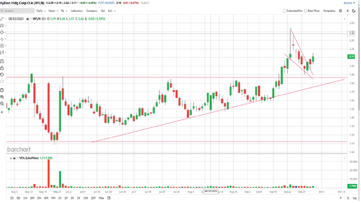 I just went long on HYLN. Not really a Ted Warren stock, per se as there is not much long-term data on this stock. I have been trading the lower time frames lately, focusing on Weekly>>Daily charts. For what it's worth, on the weekly 2yr chart, there was a channel trading between $1 and $1.90 where it broke out, then formed a downward pennant. I bought at the break of the pennant. We'll see where it goes. Here is the 6-month daily chart: