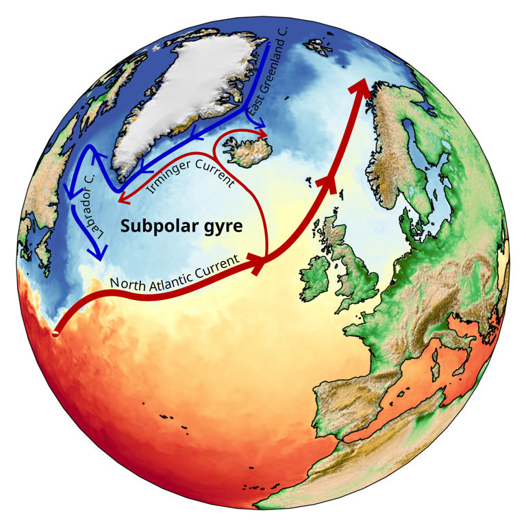 Currents in the North Atlantic subpolar gyre are also part of the AMOC, but the subpolar gyre can destabilize and cross tipping points independently of the AMOC. |