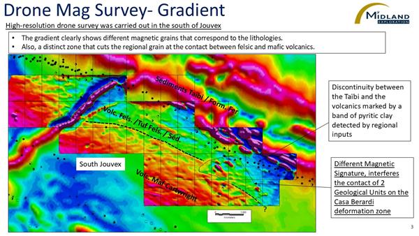 Following a recent reassessment by Midland of the potential on the Jouvex property, the south part of the project is now the main area of interest for upcoming exploration work. Based on a compilation of historical drilling, the geology was modified with the addition of a band of felsic tuffs and volcanic rocks between Taïbi sediments and Cartwright mafic volcanic rocks. These units encountered in several historical drill holes are not present in SIGEOM and open the door to potential VMS mineralization. In addition, drone-supported magnetic surveys conducted by Midland indicate the main magnetic fabric is truncated in the south part of the project. This interference, at the contact between felsic and mafic volcanic rocks, may be attributed to major structures, which are favourable emplacement sites for potential syenitic intrusions, similar to Douay and a fairly common setting for gold deposits in the Abitibi belt.