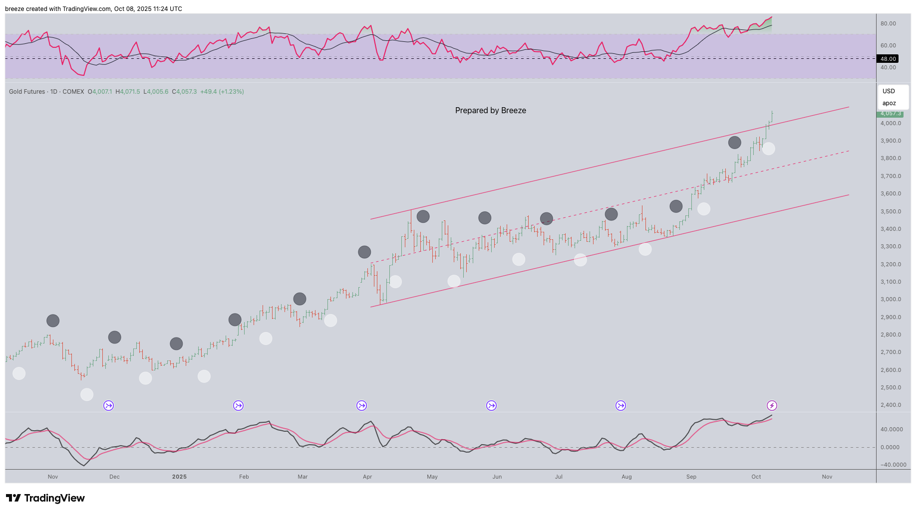Da Moon (tm) Gold Chart. Note how prices cut through the upper rail of that ascending channel. Breeze