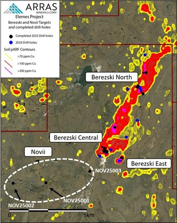 At the Novii target,  which is located 4.4 km southwest of Berezski Central, Arras has  completed three drill-holes totalling 1000m, focusing on a 2.5 x  1.5-kilometre area defined by strong arsenic-in-soil anomalies and  hematite-filled fractures (see Figure 5). The program intersected layers  of volcanic and limestone rocks. Notably, hole NOV25001 encountered  zones of massive sulphide mineralization within faults and fractures,  while hole NOV25003, targeting the southern continuation of the magnetic  low associated with mineralization at Berezski Central, intersected  brecciated andesites and diorites beneath the volcanic cover containing  porphyry-style mineralization, including B-type quartz-molybdenite veins  and finely disseminated chalcopyrite. Assays are pending and expected  next month.