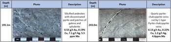 Mineralization consists of disseminated and patchy  pyrite with minor zones of bornite and chalcopyrite mineralization.  Several intense zones of hematite-magnetite and k-feldspar-quartz veins  were intersected with associated pyrite, chalcopyrite and bornite.