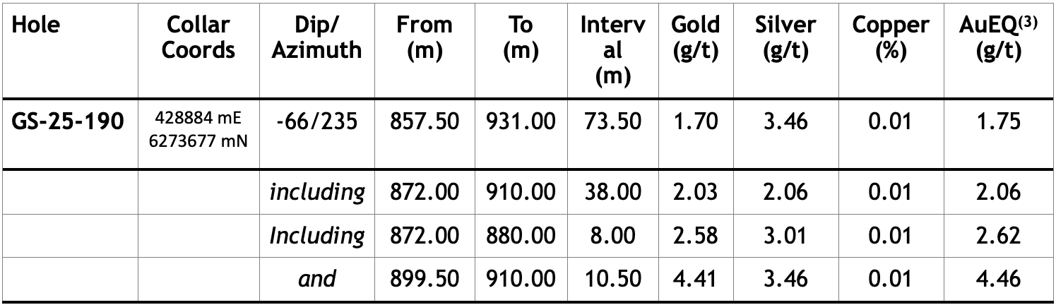 See Table 1 below for select drill results of hole GS-25-190 accompanied by a plan map and cross sections.1.70 g/t gold, 3.46 g/t silver and 0.01% copper (1.75 g/t gold equivalent (“AuEQ”)) over 73.50 m, including:2.03 g/t gold, 2.06 g/t silver and 0.01% copper (2.06 g/t AuEQ) over 38.0 m, including: 2.58 g/t gold, 3.01 g/t silver and 0.01% Cu (2.62 g/t AuEQ) over 8.00 m; and4.41 g/t gold, 3.46 g/t silver, 0.01% copper (4.46 g/t AuEQ) over 10.50 m