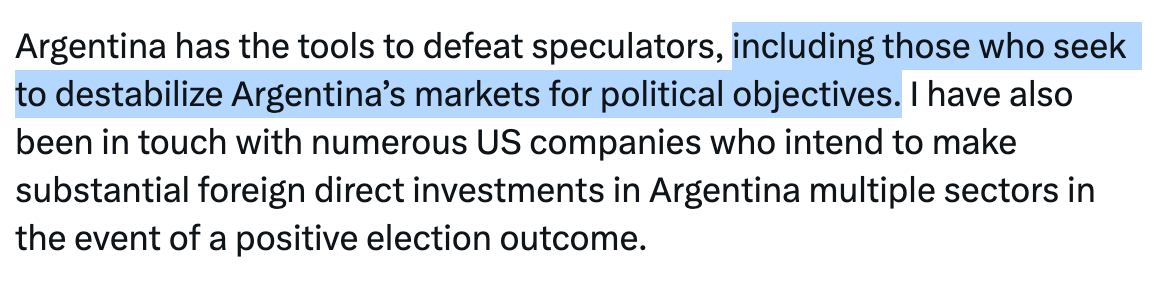 ......What I failed to point out in my previous post was that the Bessent’s money-drop was not only an attempt to bail out Argentina’s version of Elon Musk, it also bailed out his hedge fund buddies. (I must try to be more cynical….) One should read Bessent’s announcement when he promised aid to Milei. There’s no hint of an actual plan to sort out Argentina’s current mess. Former hedge funder himself, Bessent surely knows this. So what he offered instead as justification was a hefty dose of conspiracy theory: