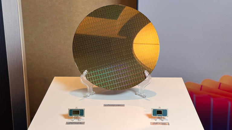 An Intel 18A wafer full of Panther Lake compute tiles. (Image credit: Future)