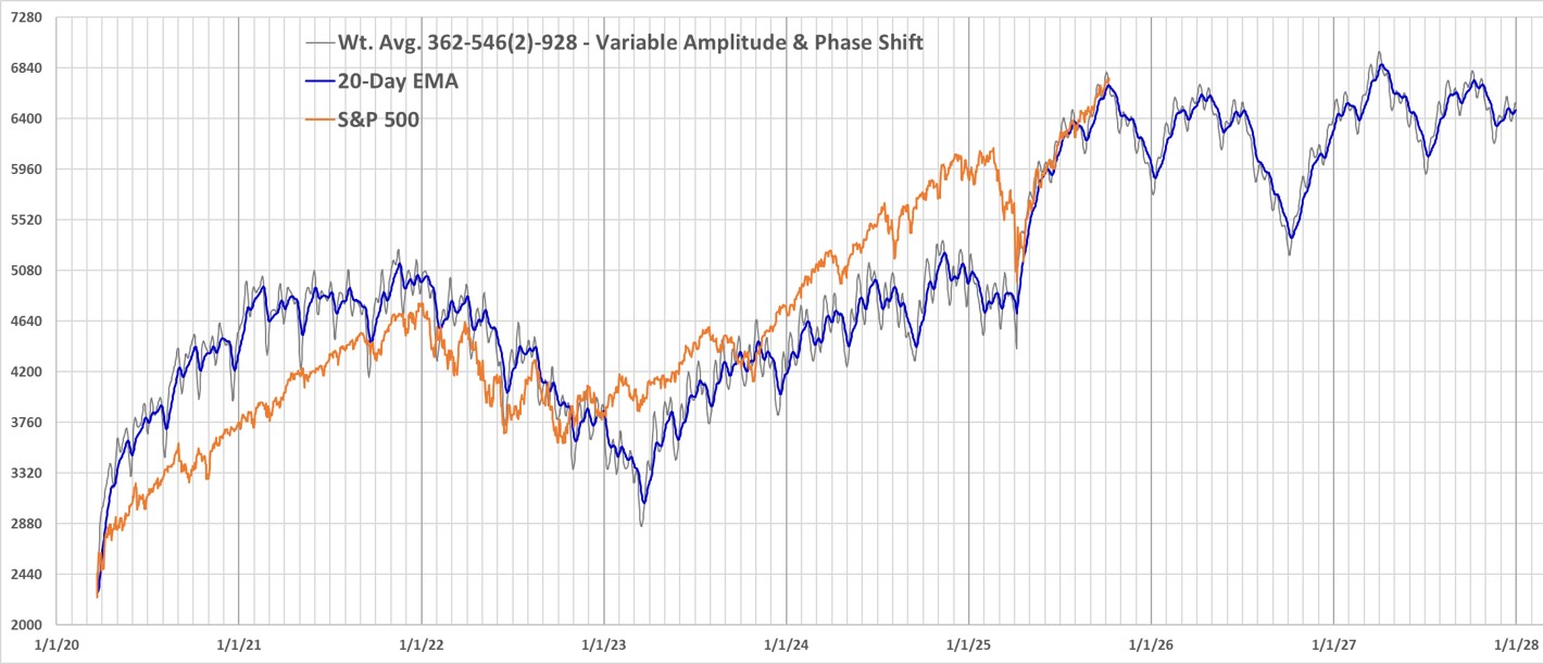 I’ve been fascinated by stock market cycles for a long time. It wasn’t too long ago that I learned about Hurst cycles (546 days, plus harmonic sub-cycles) and started working on a methodology to try to generate projected S&P significant highs and lows. After looking at some existing work online plus my own observations, I tried using several significant lows for starting dates and a few primary cycle frequencies. What I settled on was a start date of 3/23/20 and 3 different primary cycles – 328, 546, and 928 days. I then looked at another 546-day (Hurst) cycle that began on the significant low of 4/7/25. I optimized each of these separately to best align with actual prices using the amplitude of the cycle and sub-cycles as variables, and then optimizing again by a phase shift of the sub-cycles. I then combined each of those results using an optimized weighting of the daily projections of each one to come up with a composite plot.