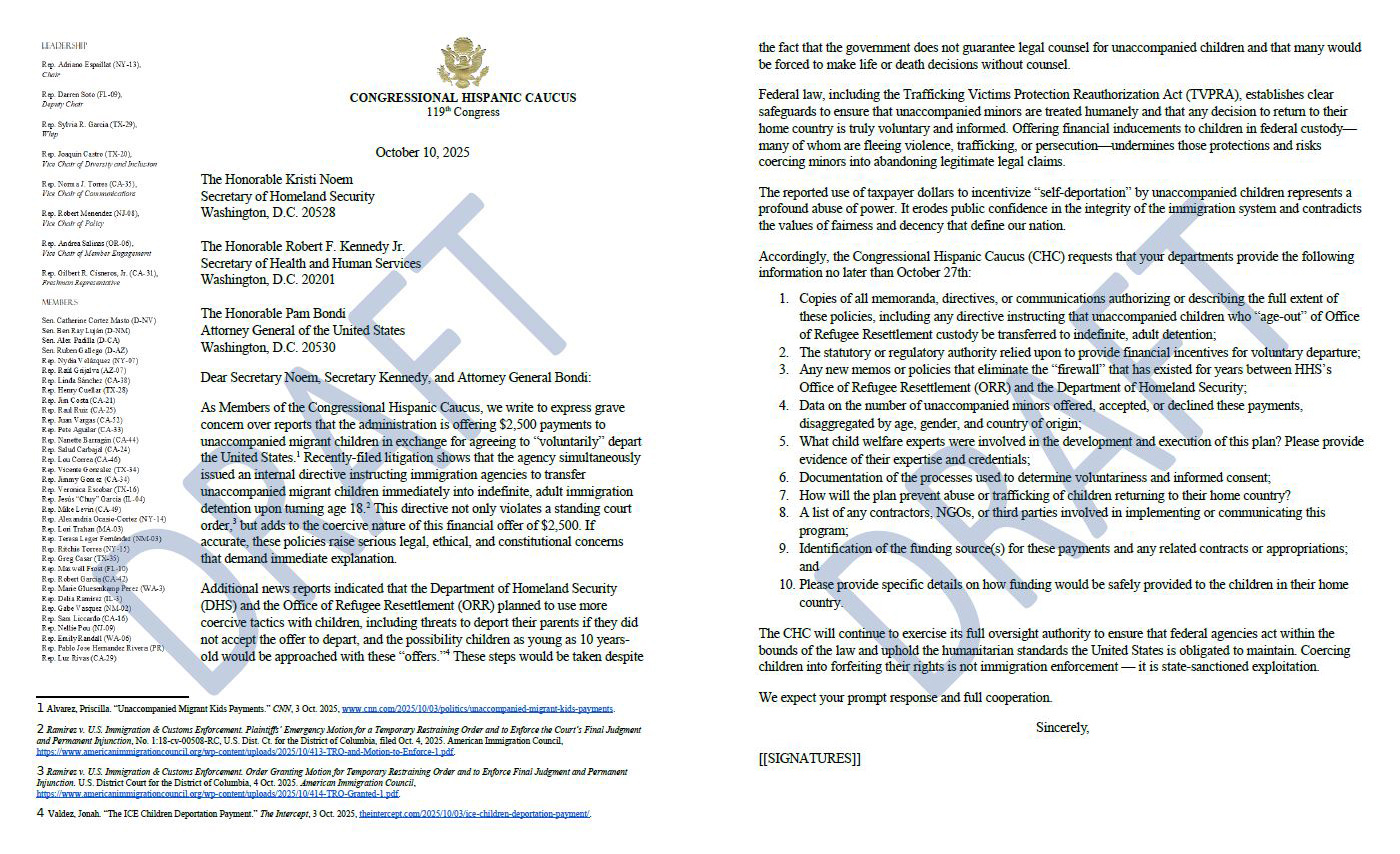“Recently-filed litigation shows that the agency simultaneously issued an internal directive instructing immigration agencies to transfer unaccompanied migrant children immediately into indefinite, adult immigration detention upon turning age 18,” the CHC letter, addressed to Health and Human Services Secretary Robert F. Kennedy Jr., Homeland Security Secretary Kristi Noem, and Attorney General Pam Bondi, states. “This directive not only violates a standing court order, but adds to the coercive nature of this financial offer of $2,500.”