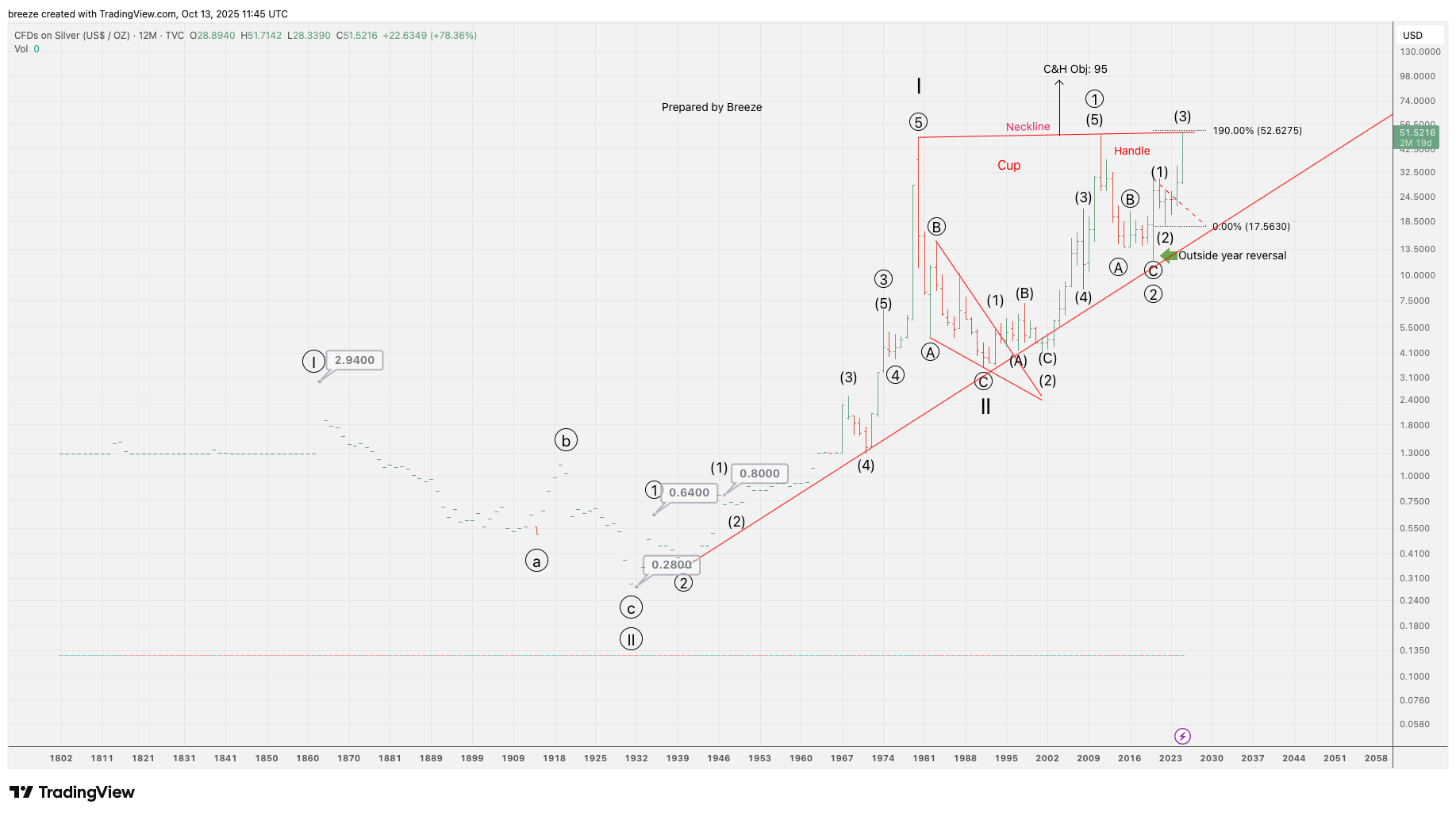 Spot Silver Supercycle Wave Count from the year 1802. Intermediate Wave (3) still in play and closing in on a 190% price extension. Note the cup&handle formation that spanned 46 years. A break and test would project on objective of 95. Breeze