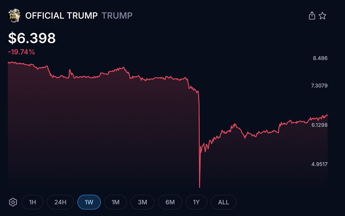 ....No, Trump was almost certainly reacting to the markets. Stocks fell sharply Friday, but the really striking action came in crypto, where Bitcoin fell 20 percent and smaller, less liquid tokens fell even more. Here, to take an arbitrary example, is what happened to the value of the official Trump coin: