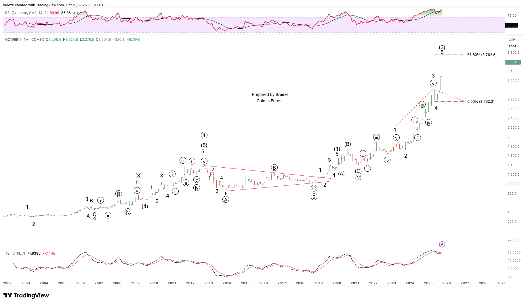 Gold iWave Count in the EURO. Minor Wave 5 of Intermediate Wave (5) is in play with a target of EUR $3,762.