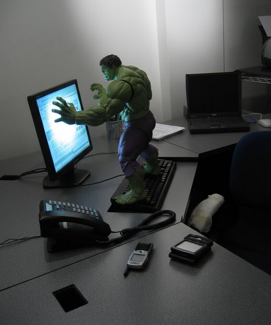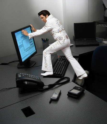 A photo of my desk 21 years ago, I asked Gemini to make Elvis push the monitor. And one with the Hulk. Here were the results.