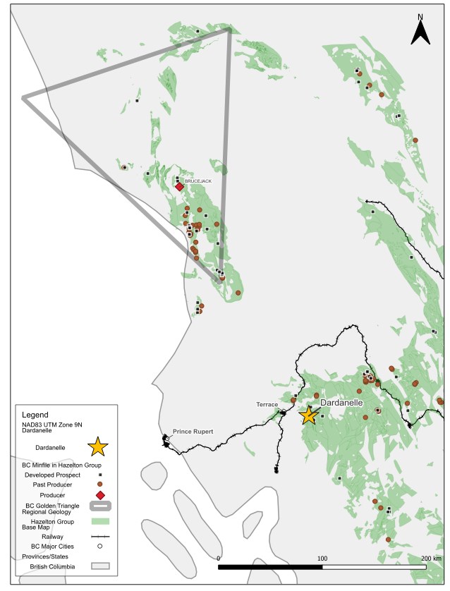 The Dardanelle property lies directly south of the Golden Triangle in British Columbia which is one of the most prolific exploration and mining districts in the world. The Golden Triangle has yielded some of Canada's largest gold and copper mines and deposits that are hosted within Triassic to Jurassic sedimentary and volcanic sequences including the Bowser Lake Group and the Hazelton Group. Dardanelle shares this highly prospective geological setting, positioning it as a potential southern extension of the Golden Triangle's mineralized corridor.