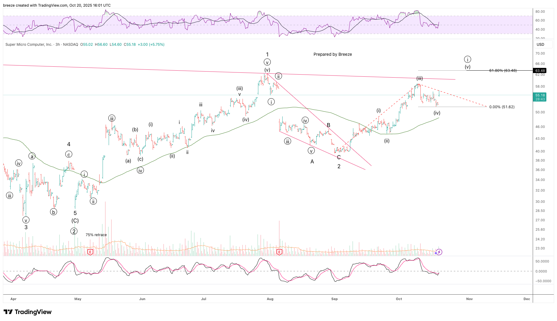 SMCI Wave Count Update. Wave (v) of Minute Wave (circle) i is in play with a target of 63.48. Breeze