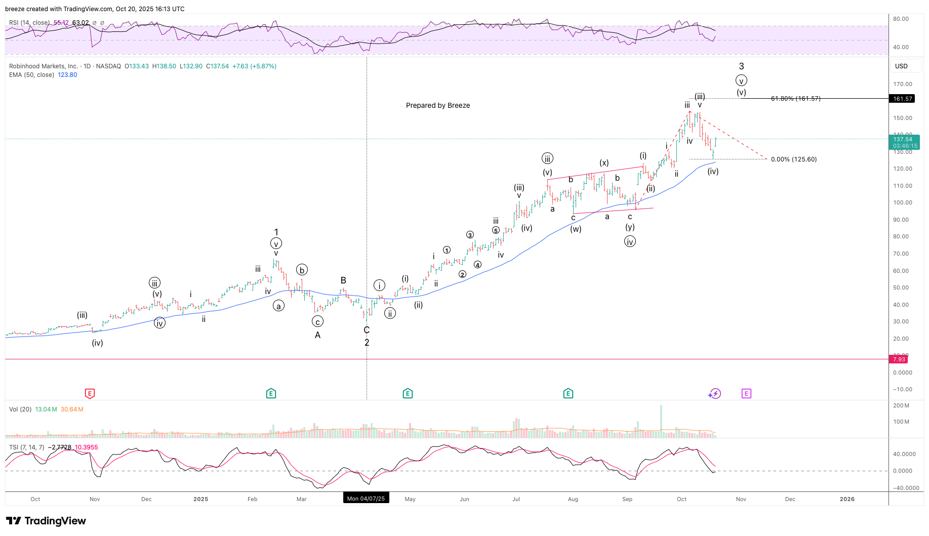 HOOD Wave Count Update. Wave (v) of Minute Wave (circle) v of Minor Wave 3 is in play with a target of 161.57. Breeze