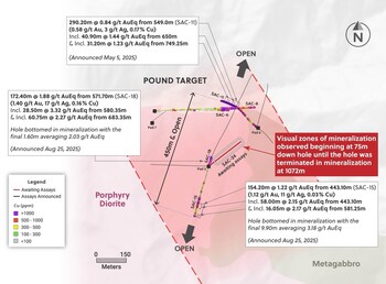 - In particular, recently completed drill hole SAC-24, which is a follow up hole to previously reported hole SAC-18 (172.40 metres at 1.88 g/t gold equivalent - 1.40 g/t Au, 0.16% Cu, 17 g/t Ag, 68 ppm Mo - and bottomed in strong mineralization; see press release dated August 25, 2025) highlights strong visual mineralization. Review of SAC-24 indicates that a first zone of intermediate sulphidation sheeted veinlet mineralization was intersected beginning at approximately 75 metres downhole which continued for up to 225 metres in length. A second, albeit narrower zone of similar style sheeted veinlet mineralization has been logged from approximately 430 metres to 500 metres downhole. Finally, porphyry style mineralization was encountered beginning at around 725 metres downhole and has been logged with various degrees of intensity until the end of the hole at 1,072 metres. The hole bottomed in mineralization as the Company decided that it makes more sense to wait for assay results from this hole before making the decision to continue to deeper depths. Assay results for drill holes completed at the San Antonio Project are expected in November 2025.